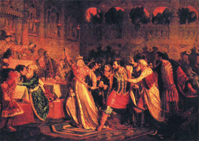 | П. Чистяков. "Великая княгиня Софья Витовтовна срывающая пояс с Василия Косого на Свадьбе Василия Тёмного." |